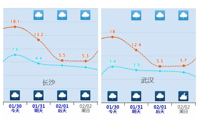 像武汉、长沙,今天最高气温超过18℃,2月1日至2日最高气温都将降至5℃左右,或刷新今冬以来新低。