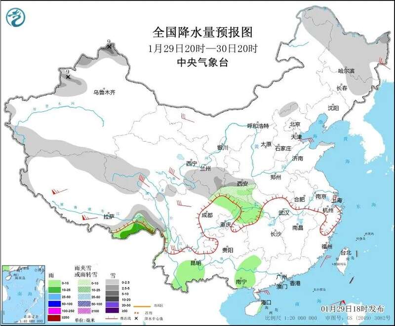 内蒙古东北部、黑龙江、吉林北部、新疆北部和南疆西部山区、西藏东南部、青海南部和西部、甘肃东南部、陕西南部等地部分地区有小到中雪或雨夹雪,其中,新疆北疆北部和沿天山等地部分地区有大雪。西藏东南部、陕西南部、湖北西部、四川盆地北部、重庆北部、云南中南部、广西中南部等地部分地区有小到中雨。