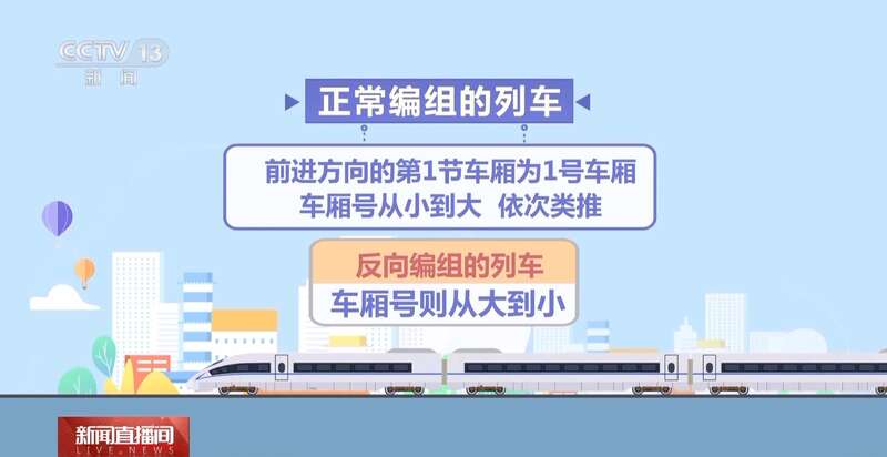 正常编组的列车,前进方向的第1节车厢为1号车厢,车厢号从小到大,依次类推;反向编组的列车,车厢号则从大到小。