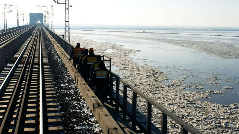每天桥上都会有大约130趟列车通过。每次列车呼啸而过,都会把寒风“砸”在我的脸上。在这样的环境里,我们一路检查桥梁的设施有没有损坏。
