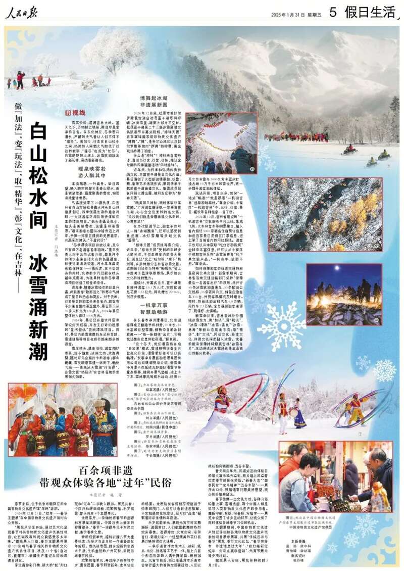 新雪季以来,吉林各地纷纷围绕冰雪发力,做“加法”,变“玩法”,“冰雪+漂流”“冰雪+温泉”“冰雪+林海”等新业态层出不穷;取“精华”,彰“文化”,民俗文化、非遗文化、体育文化深度融入冰雪。完善的服务保障持续擦亮吉林“冰雪名片”,生动讲述冰天雪地也是金山银山的振兴故事。