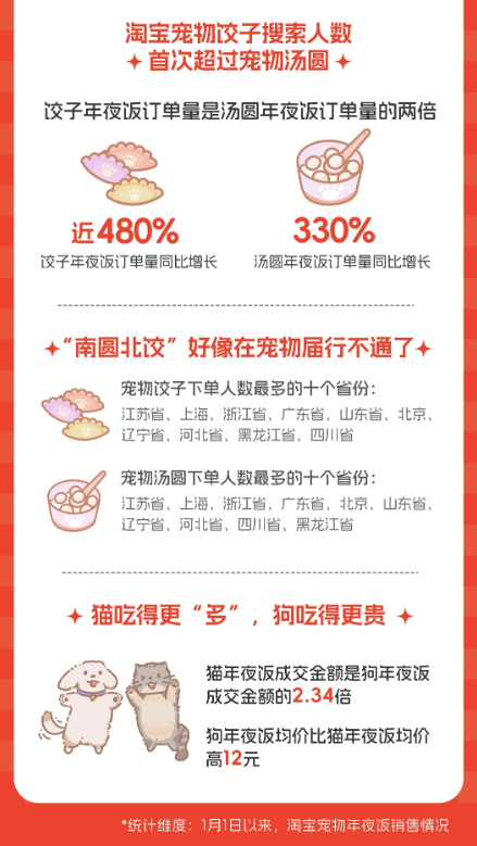 淘宝宠物行业负责人孙黎明说:“数据显示,猫年夜饭成交金额是狗年夜饭成交金额的2.34倍,而狗年夜饭均价比猫年夜饭均价高12元。”