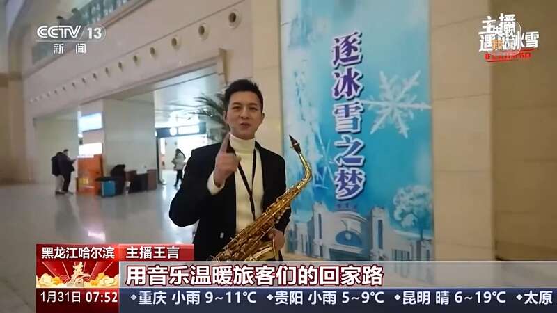 主播 王言:音乐元素在哈尔滨随处可见,这里是有百年历史的哈尔滨火车站。在火车站的候车大厅,有一个专门的艺术舞台,每年都有这里的专业乐手和来自音乐院校的学生们,为大家来进行音乐表演,用音乐温暖旅客们的回家路,今天我也加入他们。