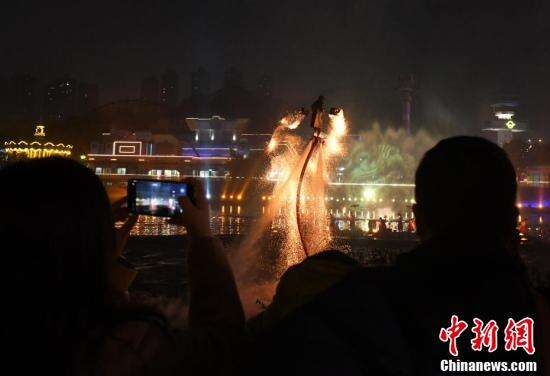 游客欣赏水上火壶表演。