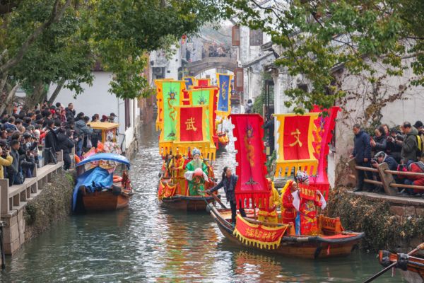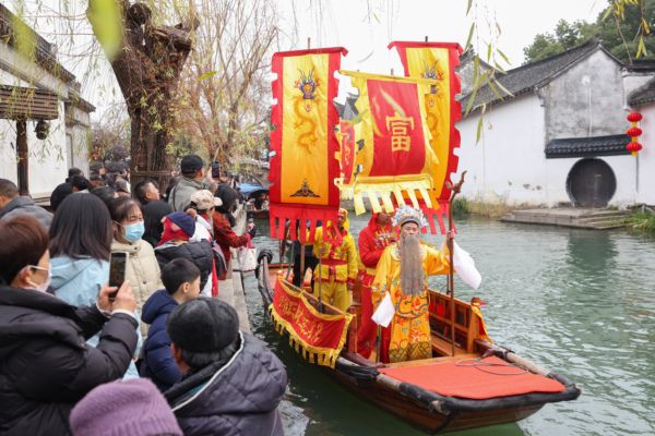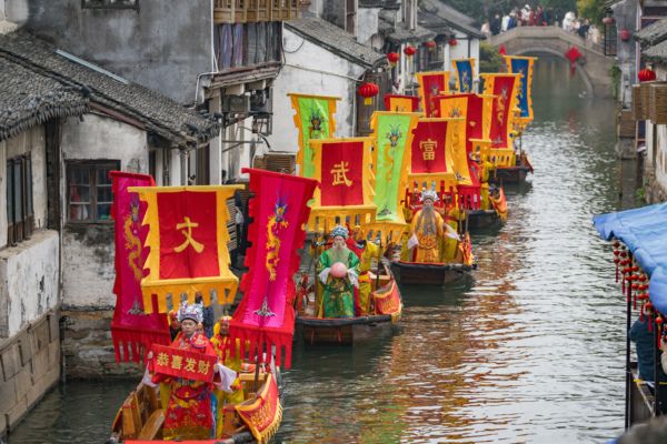江苏昆山:周庄古镇彩旗招展 水上巡游迎财神