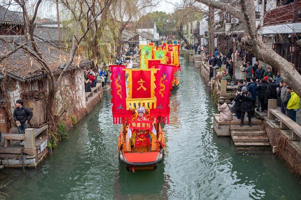 2025年2月2日,大年初五,江苏昆山周庄古镇举行盛大迎财神活动。 现场彩旗招展,锣鼓齐鸣,民众着传统服饰举行庄重仪式,随后进行水上与街道巡游。游客纷纷驻足观看,共庆新春,古镇洋溢着浓厚节日氛围。