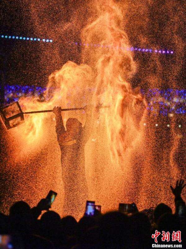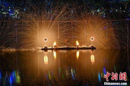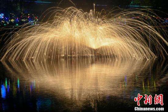 桂花湖畔民间艺人正在表演非遗技艺“打铁花”。