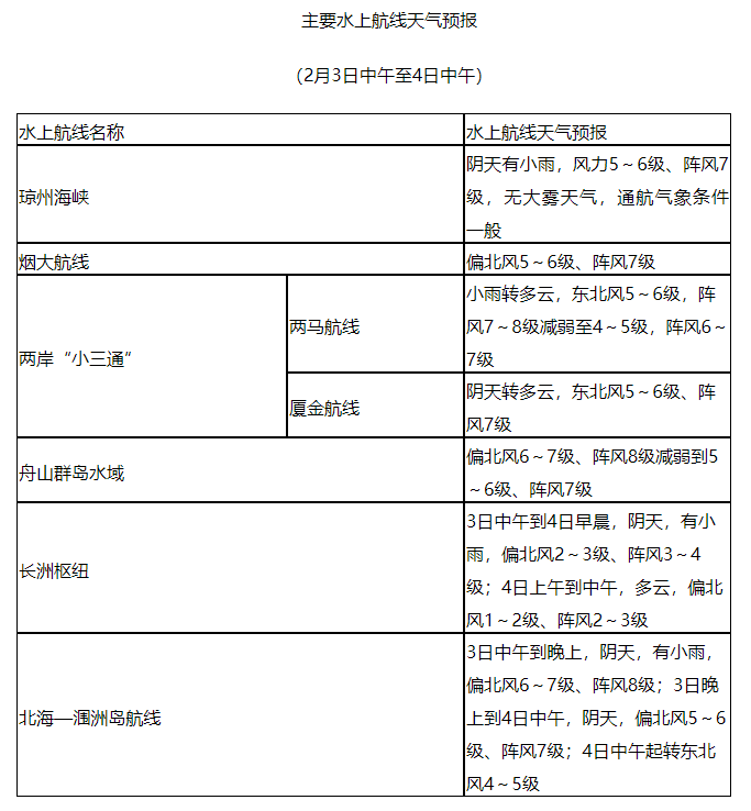 △ 主要水上航线天气预报(2月3日中午至4日中午)