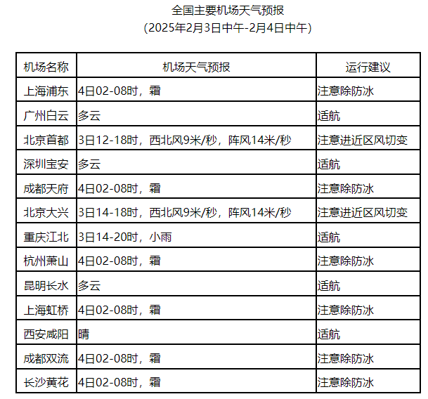 哈尔滨、长春等机场有小雪;3日下午,首都、大兴、太原、青岛等机场有6~7级阵风;4日凌晨至早间,预计乌鲁木齐机场有500~800米的大雾,成都两场、武汉、长沙、合肥、南昌、南京、上海两场、杭州等机场有霜。