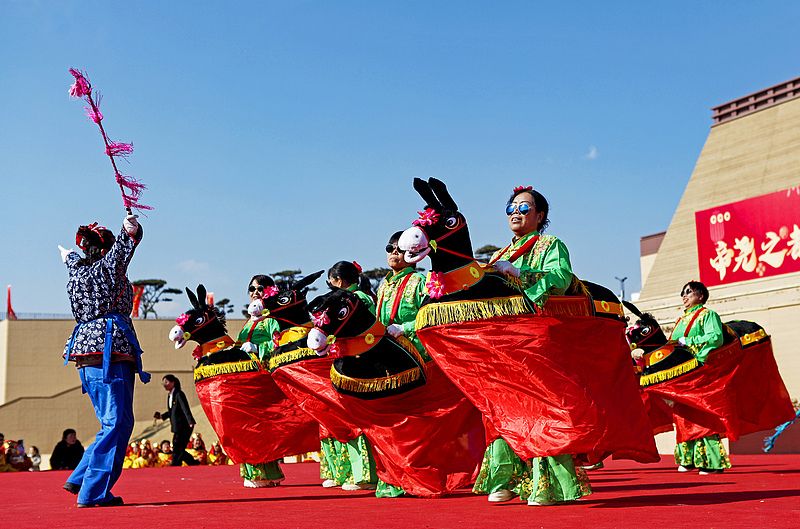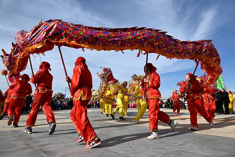 2025年2月4日,在山西省临汾市襄汾县陶寺遗址博物馆南广场,社火队员在为游客表演新春社火节目。