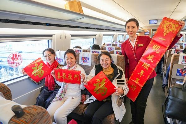 天津客运段京津城际列车员王跃在C2221次列车上向旅客赠送福字和春联。中国铁路北京局集团有限公司天津客运段供图