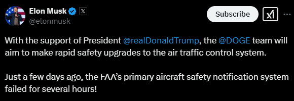 当地时间2月5日,美国企业家埃隆·马斯克在社交媒体上发文称,在特朗普总统的支持下,他领导的政府效率部(DOGE)团队将对空中交通管制系统进行紧急安全升级。他还提到,几天前,美国联邦航空管理局(FAA)的安全通知系统出现了数小时的故障。