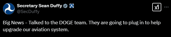 美国交通部部长肖恩·达菲也证实这一消息,称马斯克的团队将“参与帮助升级美国航空系统”。