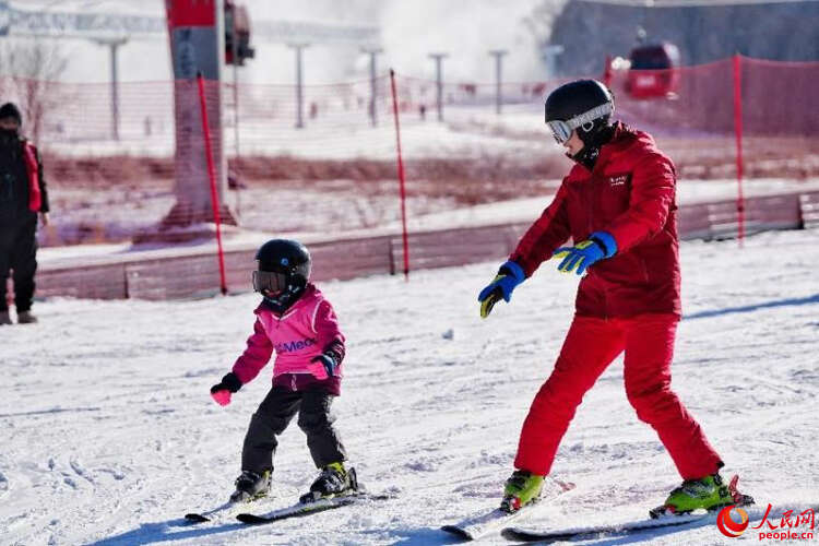 在吉林北大湖滑雪度假区,一名小朋友在教练的指导下学习滑雪。人民网记者 李洋摄