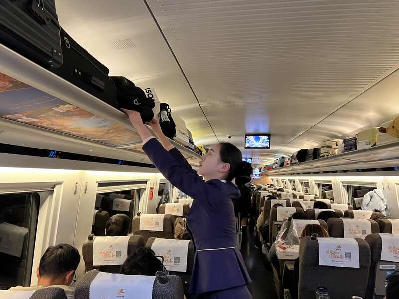 “G2373次列车乘务人员请注意,G2373次列车开始检票,请打开车门,迎接旅客上车!”7时5分,车站广播响起,陈晶晶站在列车车厢门口,迎接旅客。7时15分,列车从上海虹桥站缓缓驶出。陈晶晶来到车厢,开始忙碌起来。摆放车门口的行李,让它们既不挡路又能有序摆放,不仅是个力气活,还是个技术活。只见陈晶晶上下搬腾,左右摆放,原本堆到通道的行李很快被码到一起,整齐有序。她还细心地给大小颜色相似的行李用便签做上记号,提醒旅客下车时不要拿错行李。