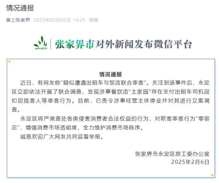 网友称“疑似遭遇出租车与饭店联合宰客” 张家界永定区通报