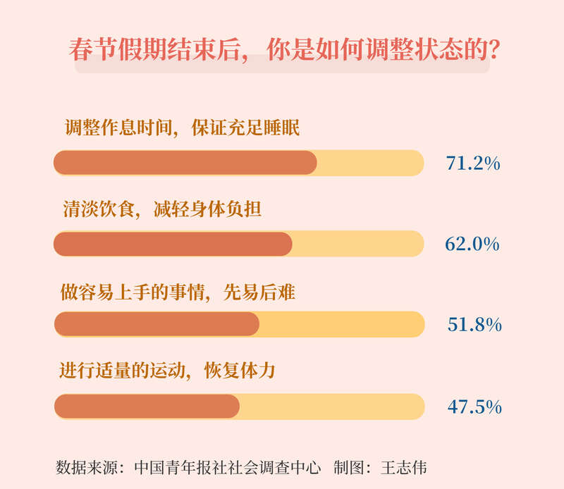 春节假期结束后,大家是如何调整状态的?调查显示,71.2%的受访者选择调整作息时间,保证充足睡眠,61.2%的受访者会清淡饮食,减轻身体负担,51.8%的受访者表示做容易上手的事情,先易后难,47.5%的受访者会进行适量的运动,恢复体力,还有19.0%的受访者选择提前返程,适应新节奏。