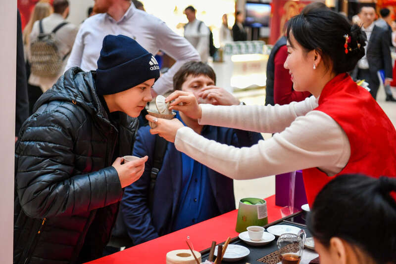 1月28日,在俄罗斯莫斯科举行的新春庙会活动上,游客在感受茶文化。新华社记者曹阳摄