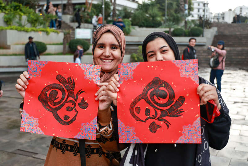 1月17日,在摩洛哥卡萨布兰卡的“中国庙会”活动现场,摩洛哥民众展示印有中国农历蛇年主题图案的木版水印作品。新华社记者霍晶摄
