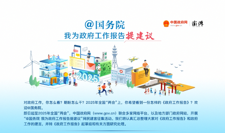对政府工作,你期盼怎么干?2024年12月20日至2025年全国“两会”期间,中国政府网(www.gov.cn)联合澎湃新闻等多家网络平台及地方部门政府网站,开展“@国务院 我为政府工作报告提建议”网民建言征集活动。我们将认真汇总整理大家对《政府工作报告》和政府工作的建言,并转《政府工作报告》起草组和有关方面研究处理。