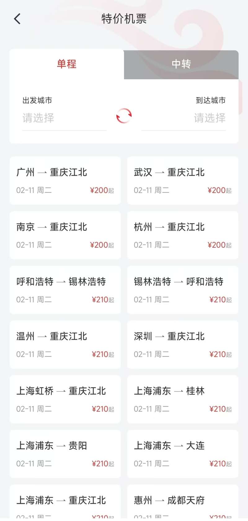 不过,多家航司的特价机票未见低于200元的票价。记者在春秋航空App搜索特价机票显示,从上海出发成都、深圳、广州、厦门等全国多地的价格均为200元以上,如上海2月14日飞往深圳的早间7:30的航班价格为229元。记者更换了多个出发地搜索,价格均未见到200元以下的。