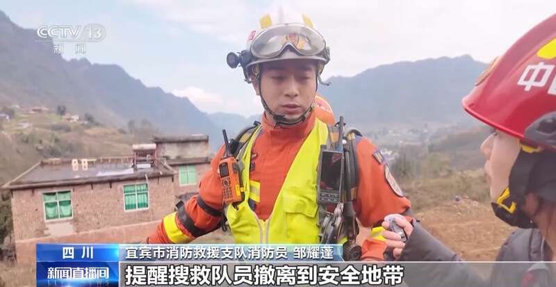 宜宾市消防救援支队消防员 邹耀蓬:观测到有危险情况的时候,我们就利用高音喇叭提醒搜救队员撤离到安全地带。