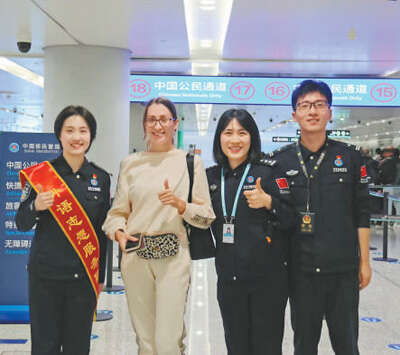 得益于过境免签政策,从巴黎途经上海转机的法国游客多姆宁·戈里耶和朋友们计划利用转机停留时间游览上海。戈里耶表示:“春节期间,在上海能看到很多喜庆元素,我们很高兴能参加节庆活动。”