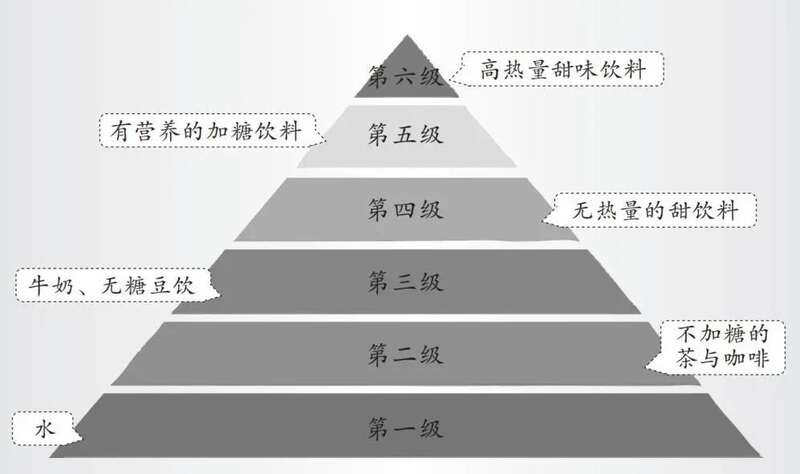 不光健康饮食有金字塔,喝水也有一个“六级”金字塔。在每天的饮水中,最应该多喝的是白水;茶水、牛奶、豆类饮品以及无糖的咖啡,有益健康,应适量摄取;加糖饮料在有需要时可适当饮用,但不是必需品;低营养、高热量的甜味饮料应少喝,更不能代替白水。
