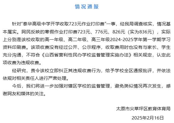 中新网2月17日电 据“尖草坪发布”微信公众号消息,针对“泰华高级中学开学收取723元作业打印费”一事,经山西省太原市尖草坪区教育体育局调查核实,情况基本属实。网民反映的寒假作业打印费723元、776元、826元(实为836元),实际上分别是该校收取的高一年级、高二年级、高三年级2024-2025学年第一学期学习资料印刷费。该项收费没有经过公开、公示程序,收取费用时也没有与家长、学生充分沟通,不符合《山西省营利性民办学校监督管理实施办法》相关规定,认定此项收费为违规收费。