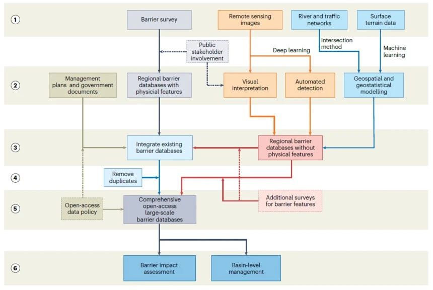 研究团队全面对比了现有的河流障碍物检测方法(记录、计数和分类),包括实地调查、建模模拟、自动化检测等。研究表明,不完整的障碍物数据库,特别是当大量的小型障碍物数据缺乏时,会导致水资源管理不可靠和低效的生态修复效率。研究探讨了不同障碍物检测方法的效率和准确性,并呼吁构建标准化的障碍物检测方法,生成可靠、全面且可共享的河流障碍物数据库,以帮助实现有效的流域管理。