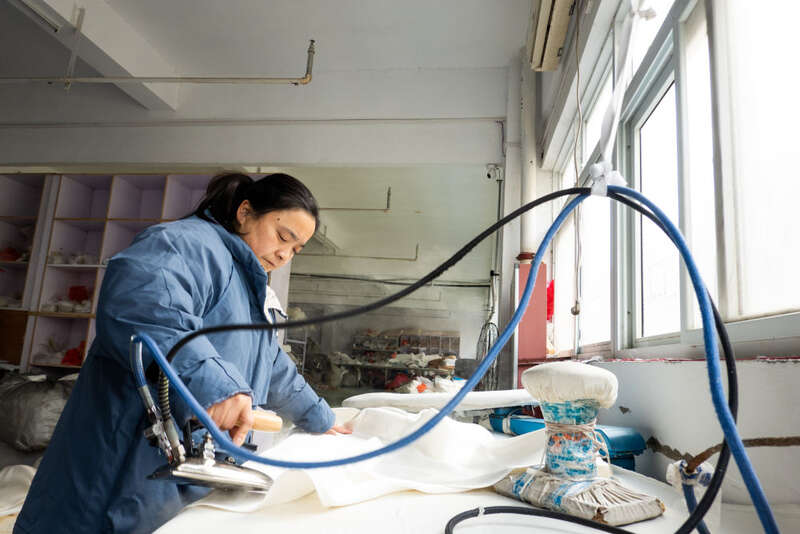 今年70岁的许昌应是第一批从苏州回流的丁集人之一。镇里较低的土地和人工成本让他看到了机遇。他将一个废弃的砖厂改造成工厂,招聘了100多人生产婚纱。