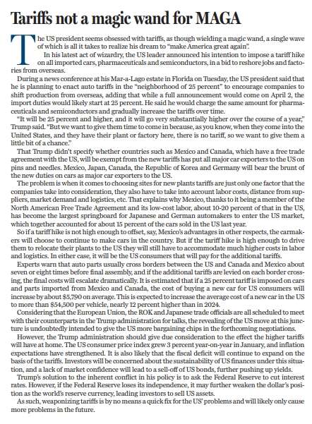 但是,特朗普政府也应该充分考虑高额关税将给其国内带来的影响。美国1月CPI同比增速升至3%,通胀预期不断加强。在加征关税的基础上,美国的财政赤字很可能将持续扩大。在这种情况下,投资者将对美国财政的可持续性产生担忧,而市场信心缺失会导致美债被抛售,从而进一步推高收益率。