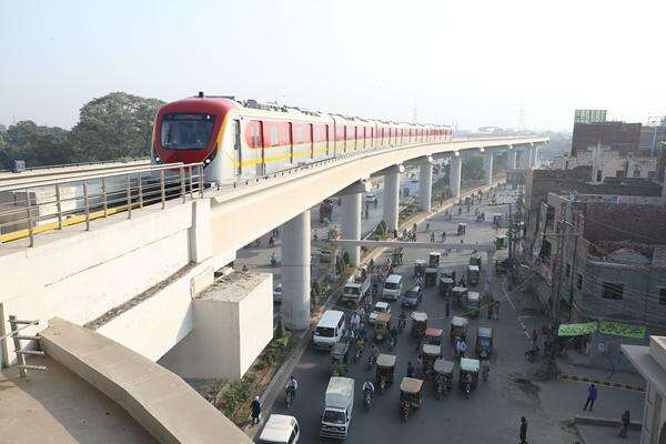 In Lahore, Pakistan, an Orange Line Metro train is preparing to enter a station. The Lahore Orange Line signifies Pakistan's entrance into the "metro era."