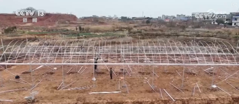 在湖南永州道县,工人们正在抓紧建设集中综合育秧大棚。大棚配套自动喷灌、恒温、通风等一体化设施,可一次性完成覆土、播种、浇水等作业流程。