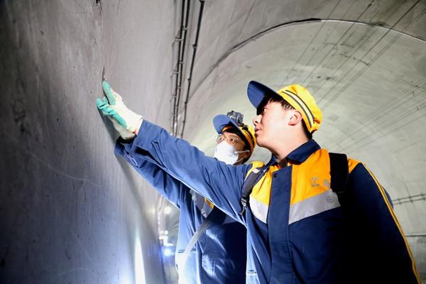 老职工冯雷半蹲着,负责下行一侧隧道衬砌裂纹检查。“裂纹宽度超过两毫米就得重点标记,后续得用载玻片监测变化。”冯雷向身旁的新工汪韩胜毫无保留地传授经验和知识。