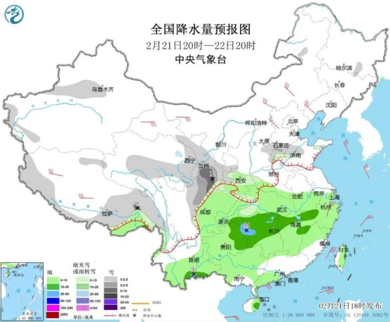 2月21日20时至22日20时,新疆沿天山地区和西部山区、西藏南部和东部、青海中东部、甘肃中南部、陕西南部、山西东部、山东西部、河北南部、湖北西部、川西高原东部等地部分地区有小雪或雨夹雪,其中,甘肃南部、西藏东部、川西高原东北部等地部分地区有中到大雪,局地暴雪。江淮西部、江汉、江南地区、西南地区东部和南部、华南西部等地部分地区有小到中雨,其中,湖南西部、贵州东部、云南南部等地局地有大雨。