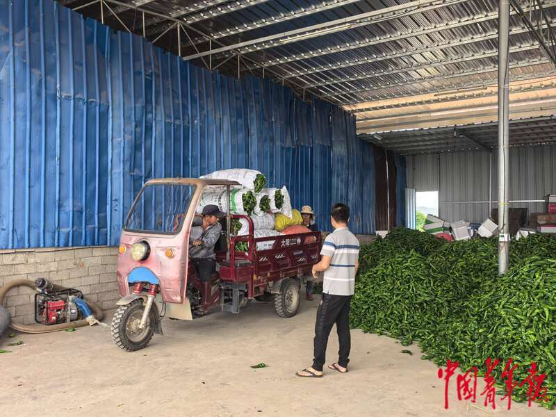 2月18日上午10点左右,中青报·中青网记者来到该收购点时,村民们拉着一车车新鲜的辣椒前来出售,而仓库里的螺丝椒早已堆积如山。收购点西边的田地里,正在收辣椒的一名陈姓农户靠自己找买主。辣椒地距收购点不到百米远,一斤辣椒的价格已从3毛变成2毛。