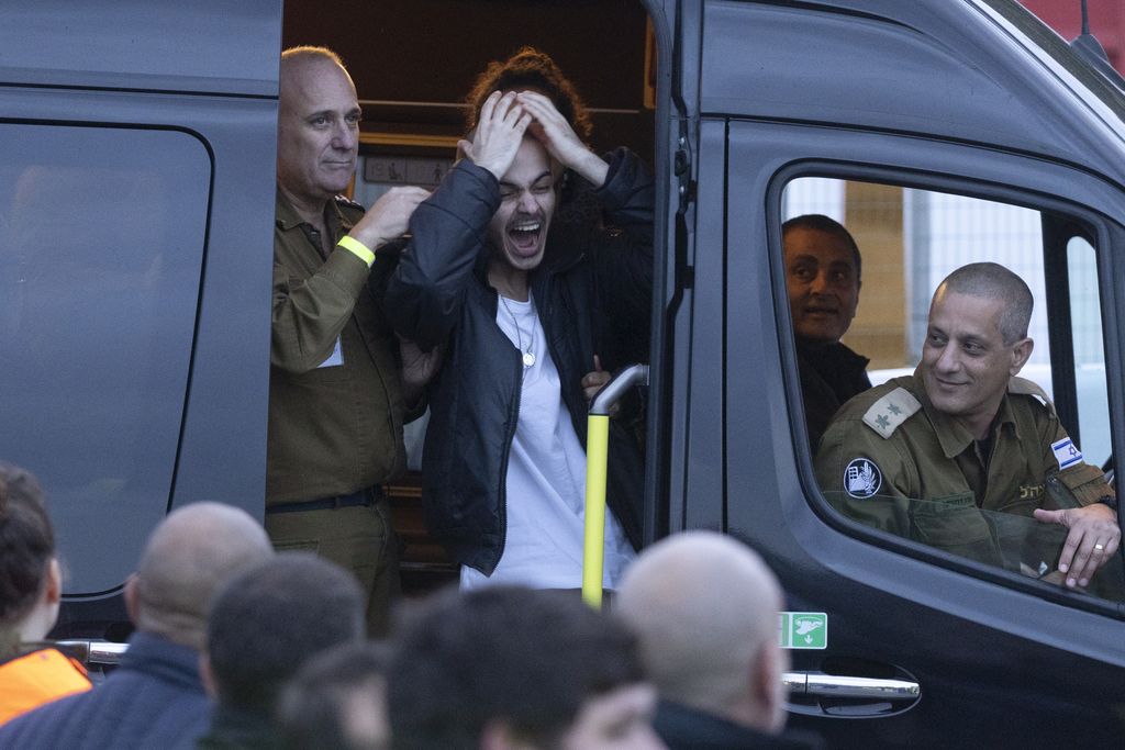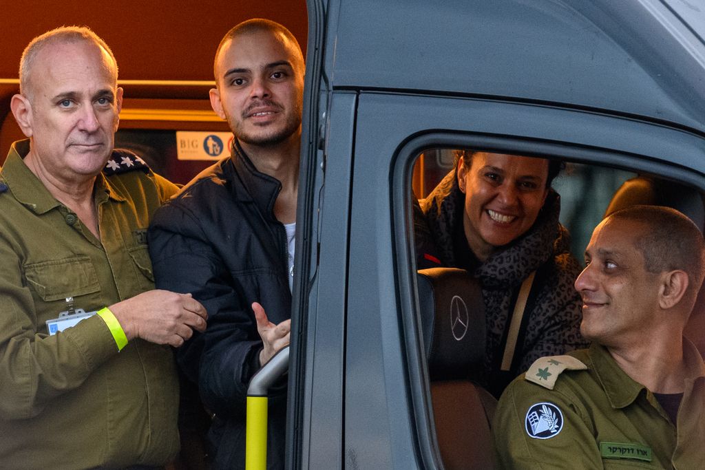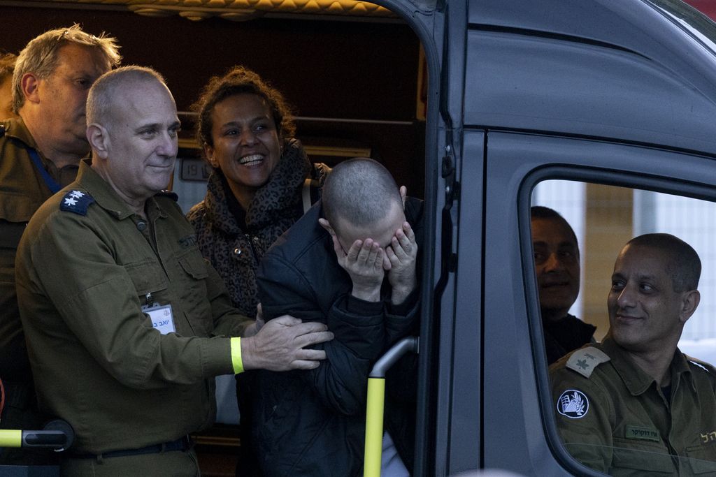 当地时间2025年2月22日,以色列彼特马提夫,获释人质欧默·温克特抵达贝林森医院。今天被哈马斯释放的六名人质分别是塔尔·肖哈姆、欧默·谢姆-托夫、伊利亚·科恩、欧默·温克特、阿维拉·孟基斯图和希沙姆·阿尔-赛义德。作为双方停火协议的一部分,以色列预计将释放超过600名巴勒斯坦囚犯。