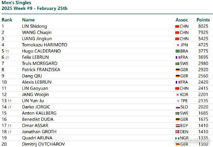 雨果·卡尔德拉诺排名上升1个名次位列第5;泛美洲杯男单冠军卡纳克·贾哈排名上升19个名次位列第26;黄友政排名上升8个名次位列第46;WTT支线赛卡帕多西亚站男单冠军徐瑛彬排名上升16个名次位列第62。