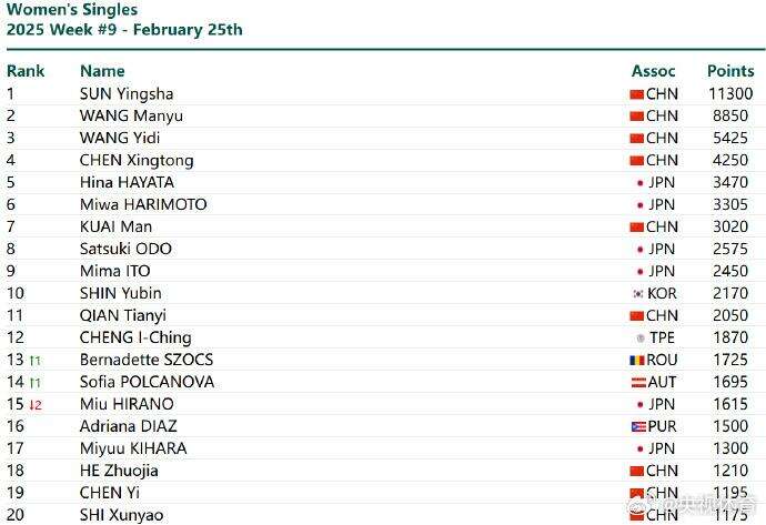 女子单打,中国队球员孙颖莎、王曼昱、王艺迪、陈幸同位列前四,蒯曼位列第七。