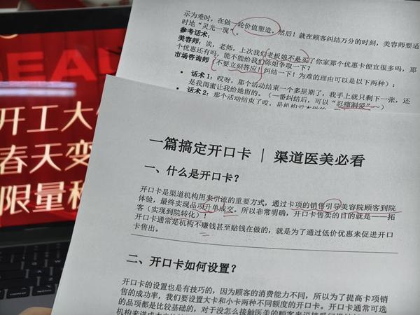 2月中旬,记者拿到一份深圳某医美机构的“内部培训资料”。资料中,除了一些医美项目的基础知识,重点内容是教销售人员如何推广营销、拓展客户以及配合医美机构完成交易。比如,销售人员可以对外宣称在自家医美机构做了某个医美项目,效果显著,发朋友圈向大家推荐,这样一来,会吸引很多人主动询问相关情况。