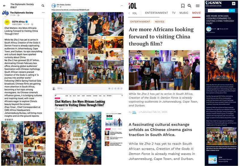 此外,中国春节档电影登陆非洲并引发广泛影响的相关报道被肯尼亚广播公司、南非独立传媒、南非《外交圈报》、全球南方新闻网、赞比亚5fm电台、津巴布韦广播公司、冈比亚之声、刚果新闻网等多家媒体转引转载,触达超1亿受众。