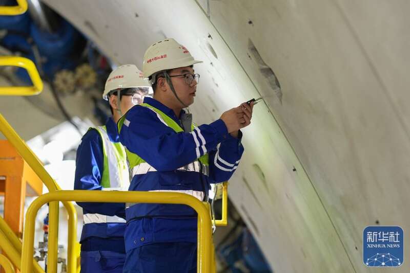 ↑ 2月25日,中铁十四局技术人员在甬舟铁路金塘海底隧道“甬舟号”盾构机内关注设备运行情况。