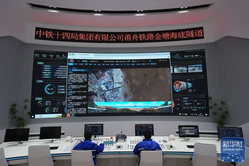 ↑ 2月25日,中铁十四局技术人员在甬舟铁路金塘海底隧道“甬舟号”盾构机操作室关注设备运行情况。