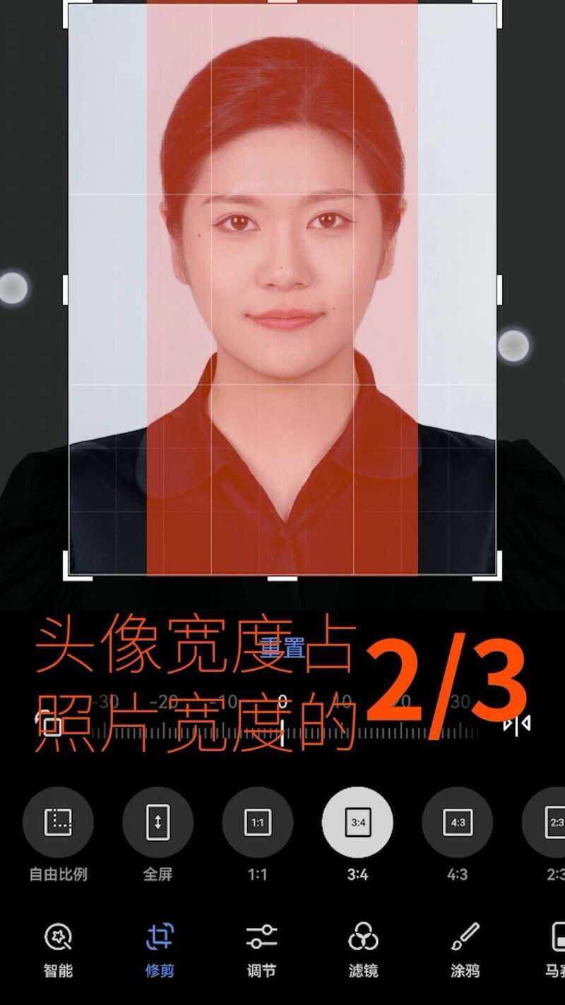 通常手机拍出的照片像素过大不符合要求,可以进行编辑裁剪,修剪成宽高比为3∶4的大头像,裁剪后头像宽度占图片宽度的2/3较为合适。