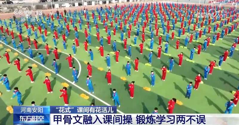 在河南安阳一学校,学校选用19个甲骨文,与音乐、舞蹈、体育等元素创新结合,通过广播体操的形式,让古老的甲骨文“活”起来。学生们整齐站在操场上,跟随音乐节奏,时而侧身模仿甲骨文“人”字;时而张开手臂,展现甲骨文“舞”字,让学生在锻炼身体的同时,把这些甲骨文深刻记忆下来。