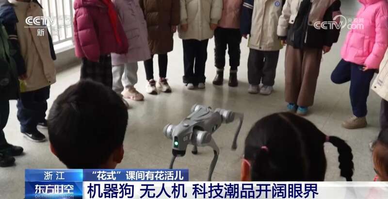 这是浙江衢州的一所学校,刚一下课,孩子们就围着一个新“课间伙伴”互动。一只银灰色的机器狗,在孩子们的操控下,它正在做跳跃运动。