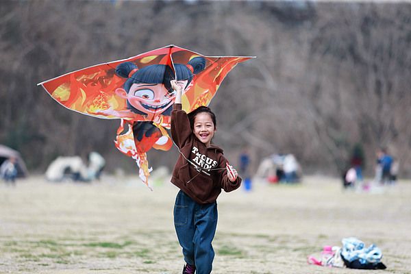 江苏扬州:孩童踏青出游 “哪吒”风筝吸睛