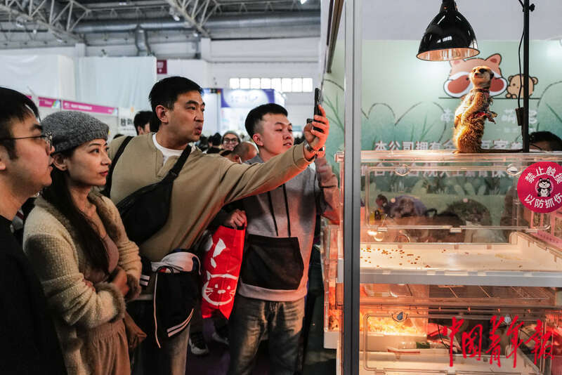 3月1日,北京中国国际展览中心(顺义馆),第12届北京国际宠物用品展,现场参观者在拍摄一只狐獴。中青报·中青网记者 赵迪/摄