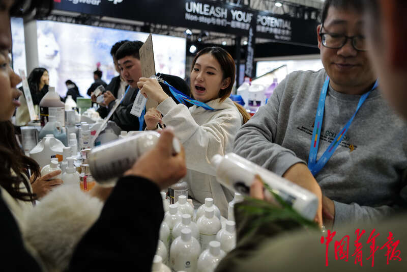 3月2日,北京中国国际展览中心(顺义馆),第12届北京国际宠物用品展,一名女士在现场售卖宠物沐浴露。 与过去单纯陪伴关系不同,现代宠物主人视宠物为家庭成员,给予其无微不至关爱。相关报告显示,47%的宠物主表示经济环境变化与消费回归理智不影响“娇养”爱宠,愿意在主粮、零食、营养品、药品、洗护清洁用品方面增加支出。中青报·中青网记者 赵迪/摄